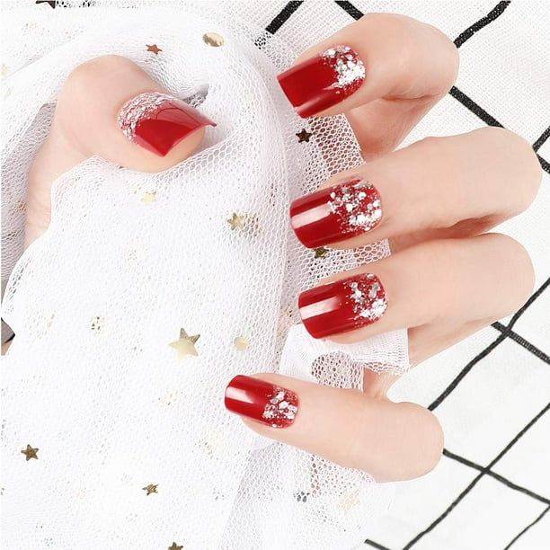 24pcs False Nail Glitter Decorated Solid Red Short Square Full False Nails Tips Red Glitter Walmart Com