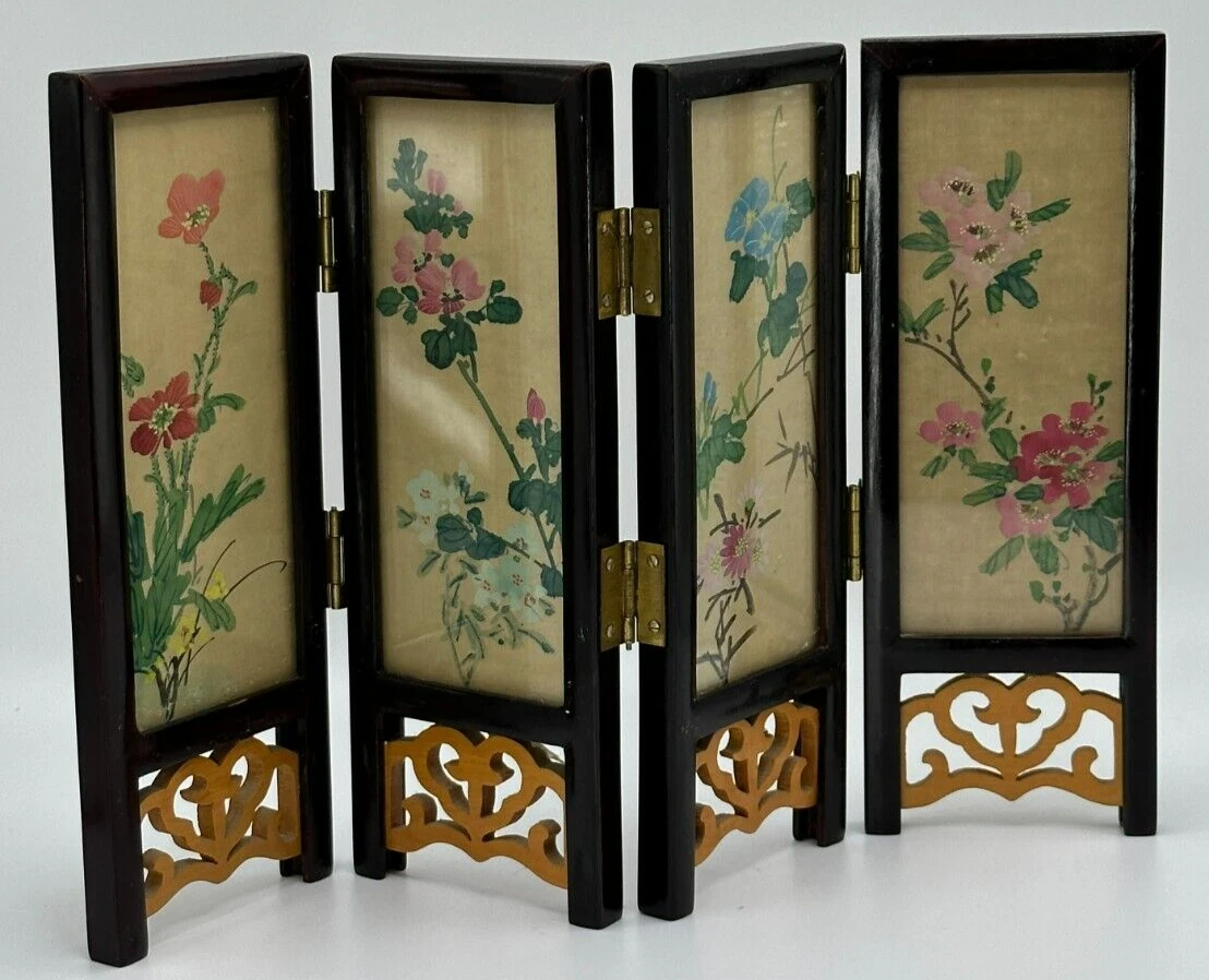 Vintage Mini Chinese Folding Screens Four Panels Silk Screen Mountains Flowers Ebay